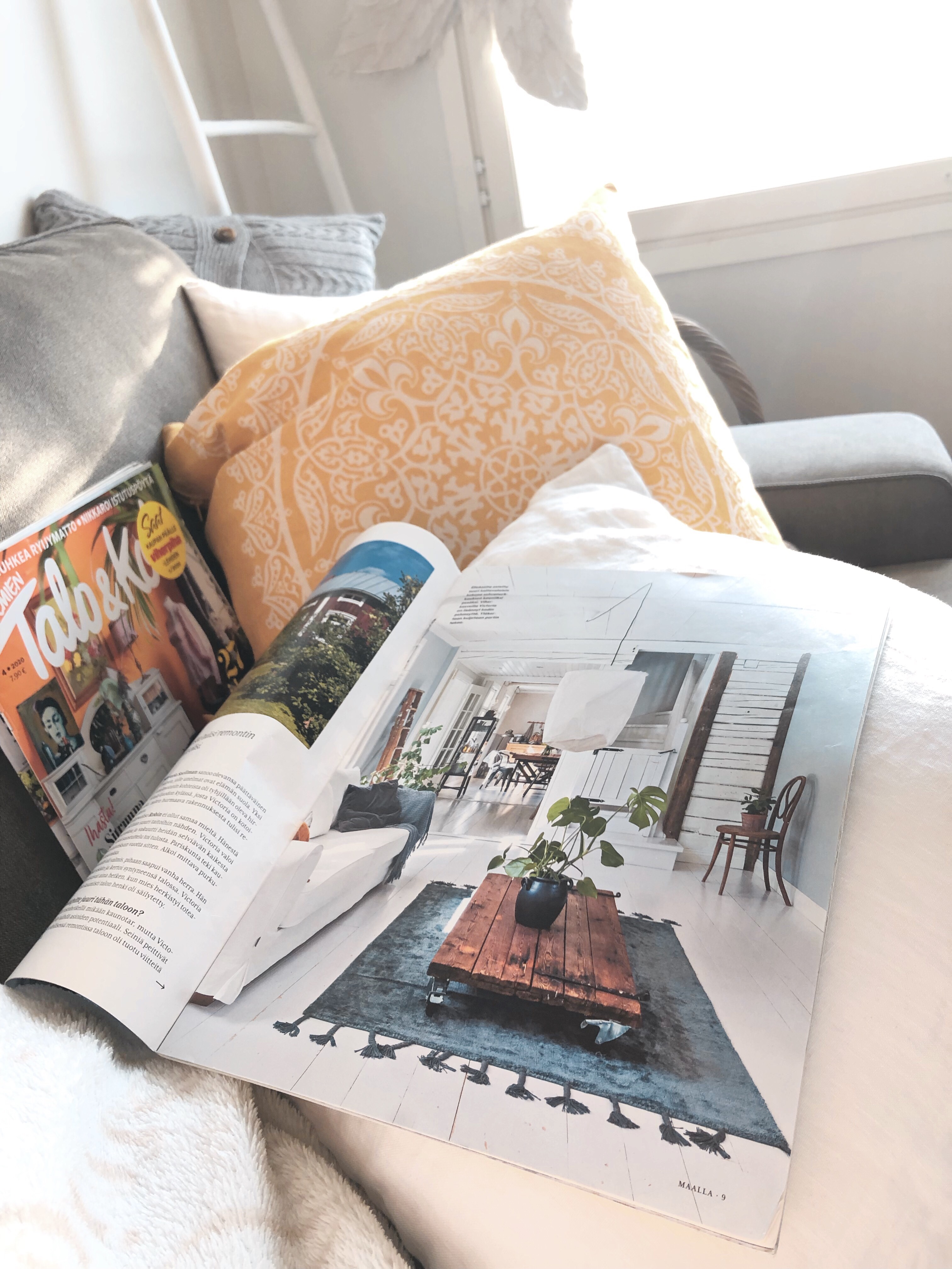Oon lepäillyt aamun nyt tässä sohvalla, tehnyt tähän oman lukunurkkauksen kahvin kera ja lukenut kasan lehtiä ja etsinyt inspistä ja ihaillut toisten koteja..